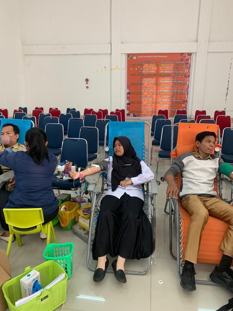 Pekanbaru, Literasiaktual.com – Mahasiswa praktek pengalaman lapangan (PPL) Universitas Islam Negeri Sultan Syarif Kasim Riau SMP Negeri 23 Pekanbaru, antusias ikut serta kegiatan bhakti sosial donor darah dalam rangka memperingati hari guru nasional 2023 yang diselenggarakan oleh dinas pendidikan kota Pekanbaru yang berlangsung di aula Dinas Pendidikan Kota Pekanbaru, selasa (07/11/2023) pagi.