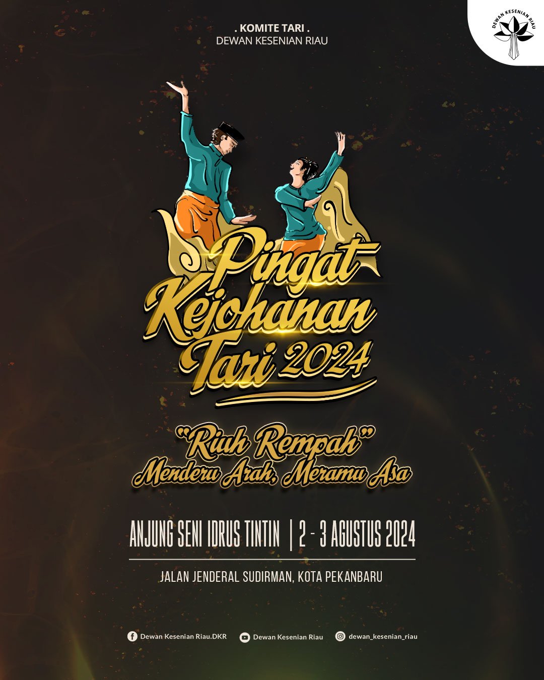 “Pingat Kejohanan Tari akan dilaksanakan tanggal 2 dan 3 Agustus 2024. Tahun ini Pingat Kejohanan Tari berkembang menjadi 2 Kategori lomba, yaitu “Kategori Karya Berkelompok” dan “Kategori Karya Tunggal”. Karya yang akan dilombakan akan diamati oleh 5 dewan juri, 3 orang juri berasal dari Provinsi Riau, dan 2 orang juri berasal dari luar daerah Riau. Terdiri dari seniman, pelaku dan pemangku seni tari di Indonesia.” ungkap Tito Aldila selaku Komite Tari Dewan Kesenian Riau