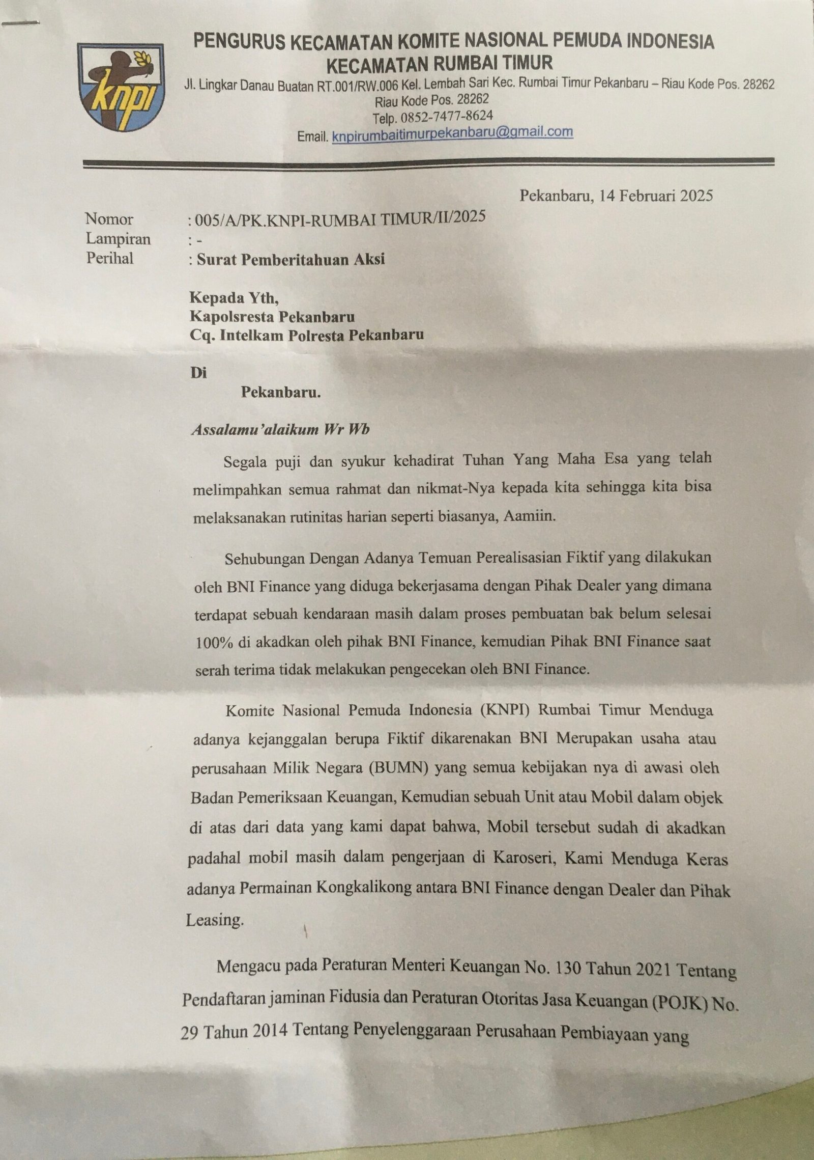 Kejadian yang terjadi pada hari Kamis, (13/02/2025) tersebut, Aditya Permana selaku ketua PK KNPI Rumbai Timur mencoba melakukan Advokasi dan Mengkonfirmasi ulang pengambilan mobil secara sepihak oleh BNI Finance Pekanbaru.