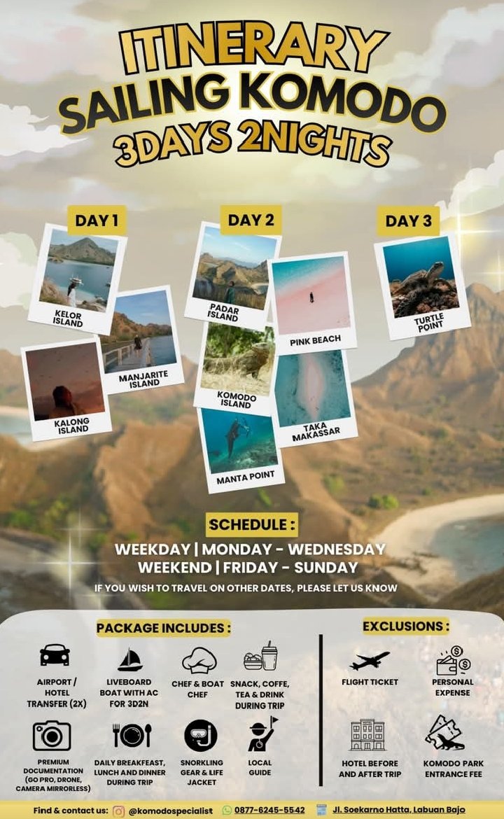 Paket wisata yang diselenggarakan Komodo Specialist Travel ini menawarkan perjalanan menggunakan kapal liveaboard berfasilitas lengkap, dilengkapi kru profesional dan chef kapal, sehingga wisatawan dapat menikmati perjalanan dengan aman dan nyaman.