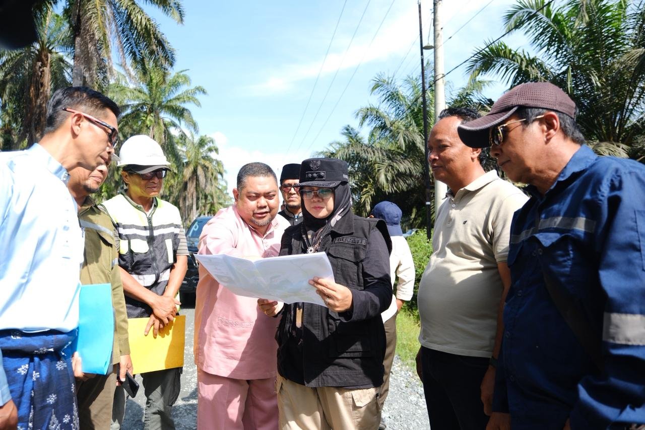 SIAK (LA) – Bupati Siak, Afni Zulkifli, meninjau langsung progres pengerjaan jalan lintas penghubung Kampung Teluk Merbau dengan Kampung Sawit Permai di Kecamatan Dayun, Sabtu (8/11/2025). Jalan sepanjang 3 kilometer ini telah menyelesaikan 1,6 kilometer dan ditargetkan rampung seluruhnya pada akhir November 2025.