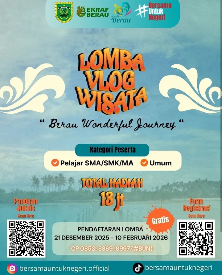 Pendaftaran lomba dibuka mulai 21 Desember 2025 hingga 10 Februari 2026. Ajang ini terbuka untuk masyarakat umum dan pelajar, khususnya generasi muda serta pelaku kreatif digital yang ingin mengekspresikan cerita tentang keindahan, keunikan, dan kekayaan objek wisata di Kabupaten Berau.
