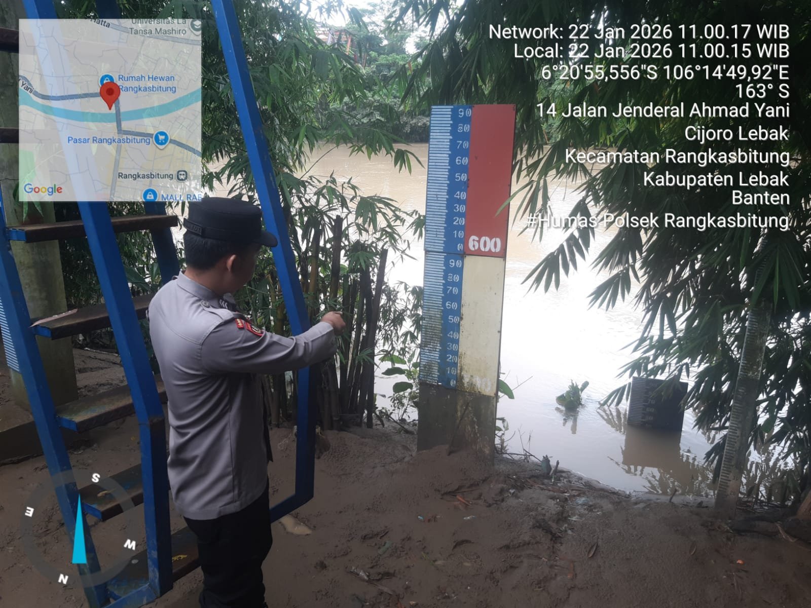 Dalam hal ini Kapolsek Rangkasbitung AKP Adi Irawan,.SH, perintahkan anggotanya untuk selalu inten melaksanakan pemantauan debit air.Kamis (22/01/2026).