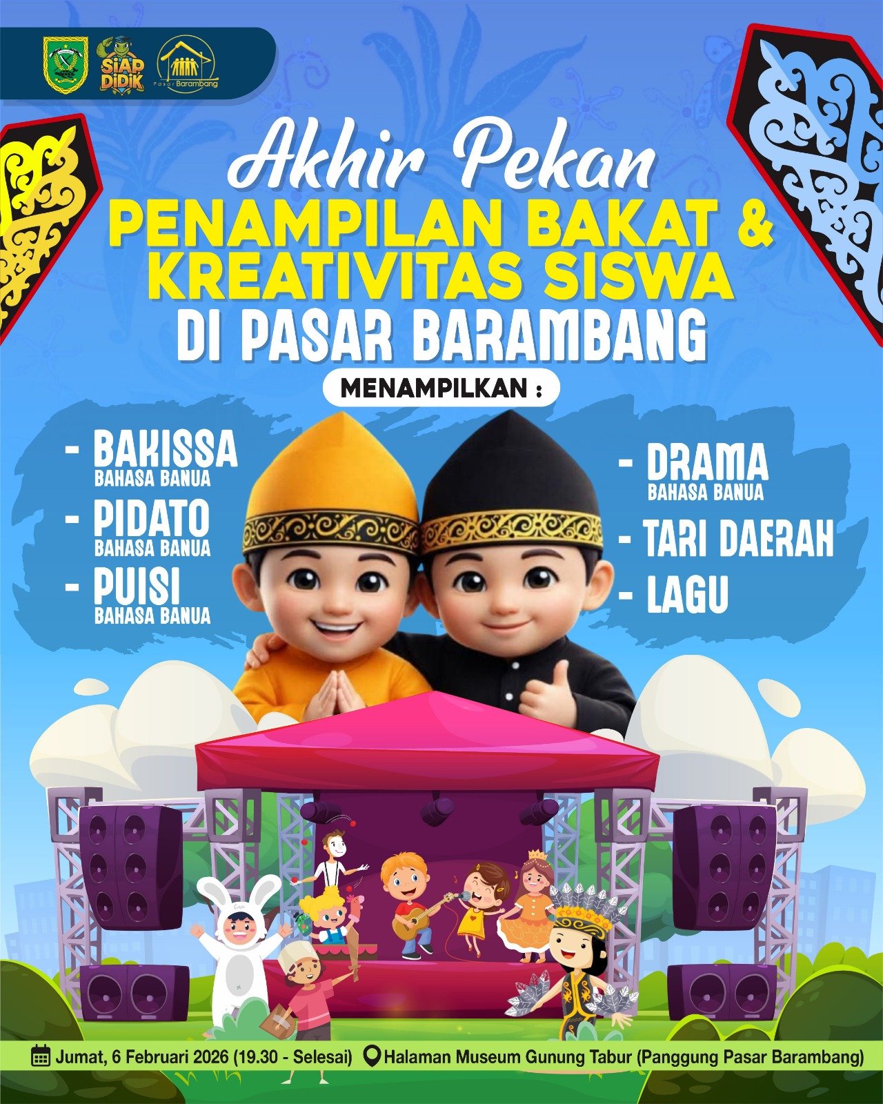 Kegiatan bertajuk Akhir Pekan Penampilan Bakat dan Kreativitas Siswa yang di laksanakan di Pasar Barambang dijadwalkan berlangsung pada Jumat, 6 Februari 2026, mulai pukul 19.30 Wita hingga selesai.