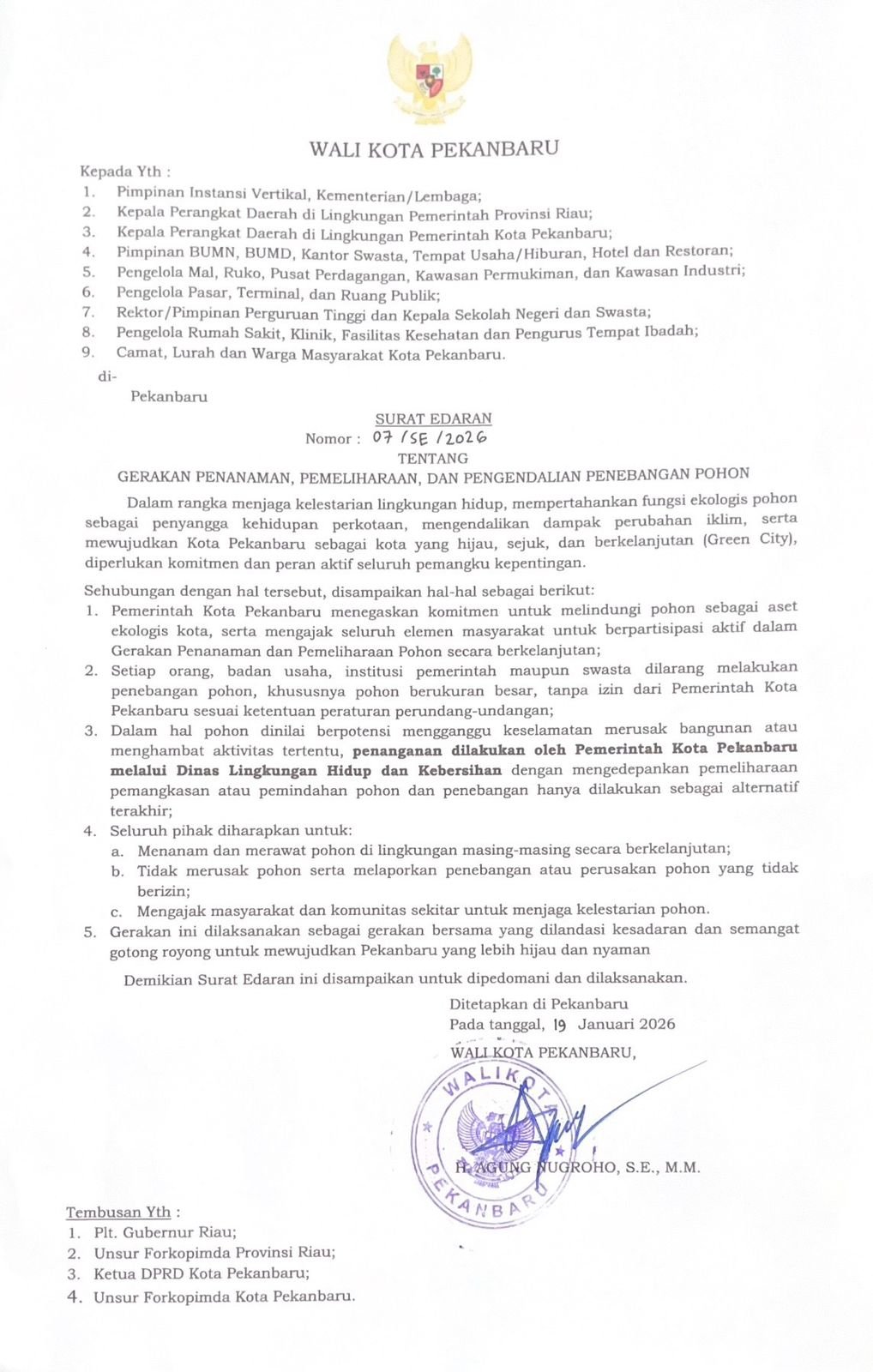 PEKANBARU – Wali Kota (Wako) Pekanbaru Agung Nugroho Terbitkan Edaran Larangan Penebangan Pohon sembarangan, hal ini menunjukan komitmennya terhadap kelestarian alam dan penjagaan lingkungan berbasis Green City.