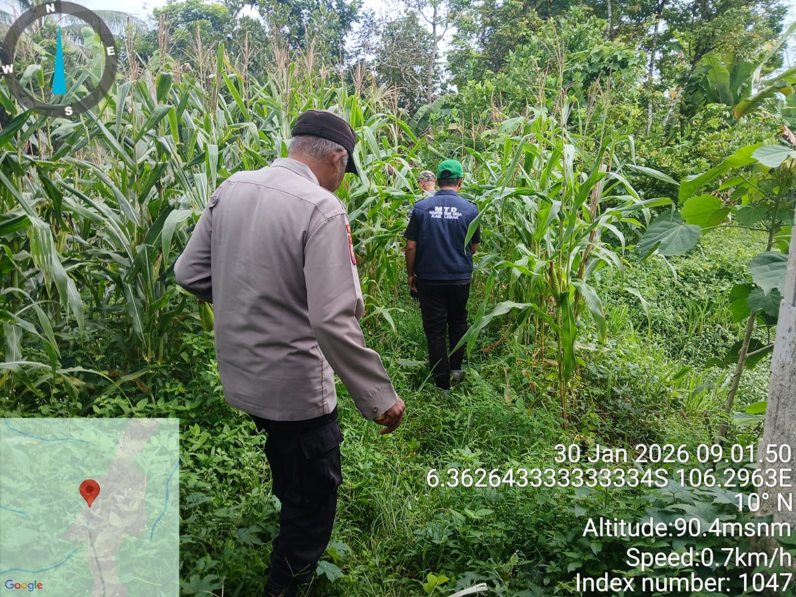 LiterasiAktual.com–Kanit Binmas Polsek Rangkasbitung Polres Lebak,AIPTU Heru Sasmito dan Mantri Tani Desa Cimangeunteng,dalam rangka mendukung program ketahanan pangan nasional,sekaligus cek pertumbuhan pohon jagung hibrida.