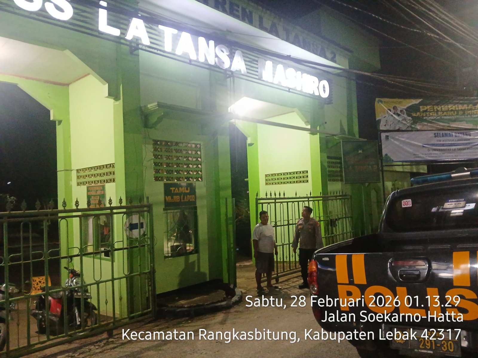 Literasaktual.com-Kanit Samapta Polsek Rangkasbitung Polres Lebak,AIPTU Terry.MS,AIPDA Didik Mahardhika dan AIPDA Wisnu Eko, melaksanakan Patroli mobipe dan temui Security Kampus La Tansa Mashiro.