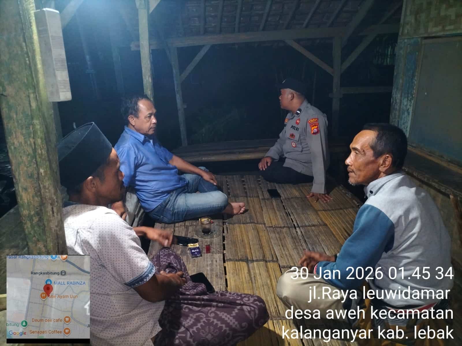 LiterasiAktual.com-Anggota Polsek Rangkasbitung Polres Lebak,AIPDA Figur Ranbo Saputro dan AIPDA Turas Catur, melaksanakan giat Patroli dan sambangi warga di pos ronda Kampung Aweh,Desa Aweh, Kecamatan Kalanganyar, Kabupaten Lebak.Jumat pagi 30 Januari 2026,pukul, 01.46 Wib.